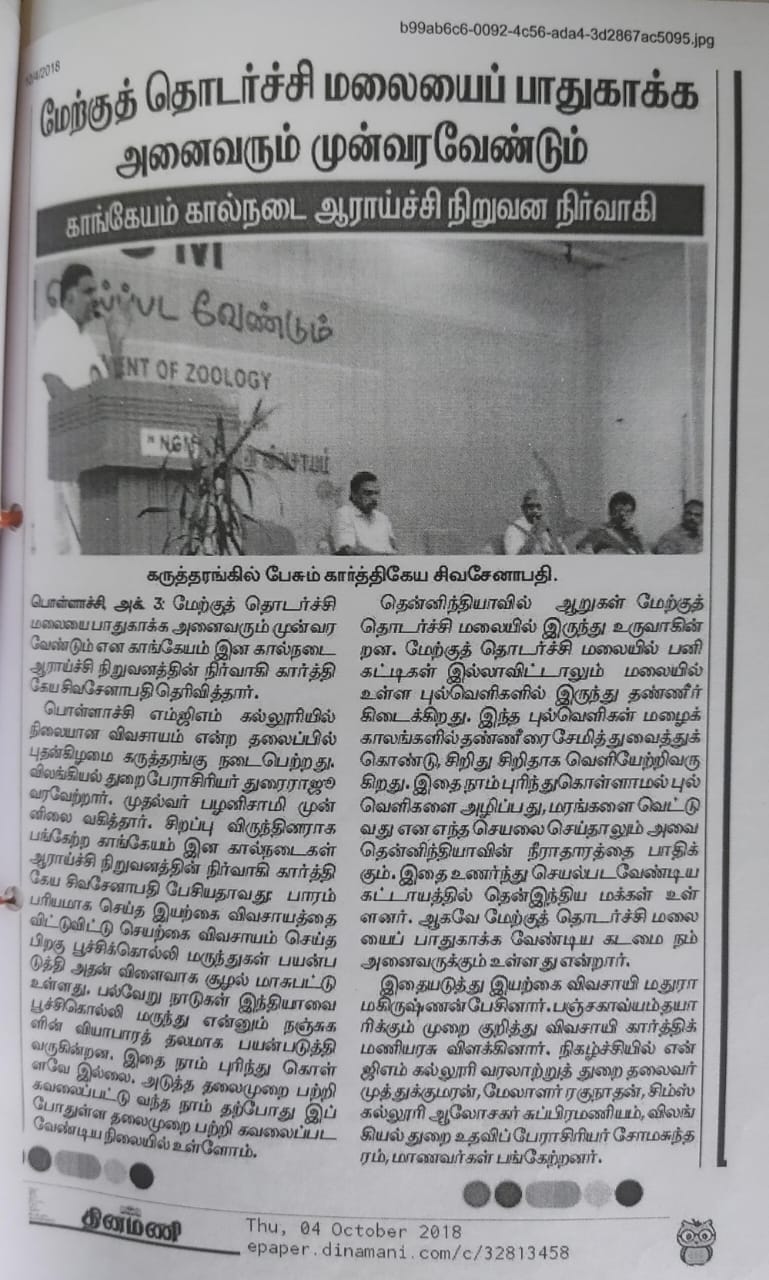 Zoology department established a club named “Club Zoa” for the theme cosmo learning of diverse life forms and it’s interacting with their environment. A host of co-curricular activities are organised every academic year to make learning beyond the class room activities which include seminars, symposium guest lecturer and outreach programmes through “Club Zoa” a departmental student participatory club.
