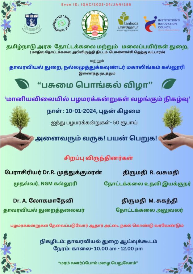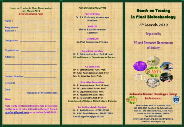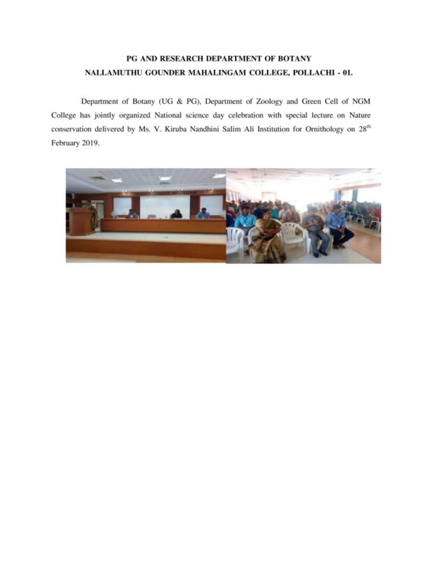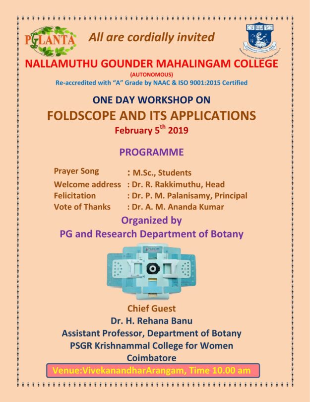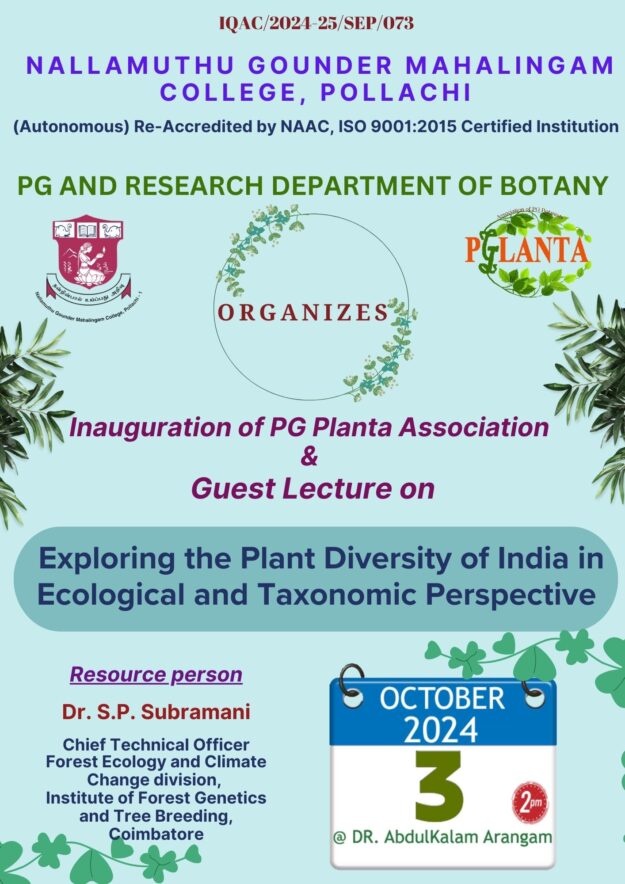 Title of Lecture: Exploring the Plant Diversity of India in Ecological and Taxonomic Perspective Date: October 3, 2024 Time: 2:00 PM – 4:00 PM Venue: Dr. Abdul Kalam Arangam PG and Research Department of Botany, NGM College, Pollachi conducted Inauguration of PG Botany association “PG Planta” for the academic year 2024-2025 and Guest Lecture on…