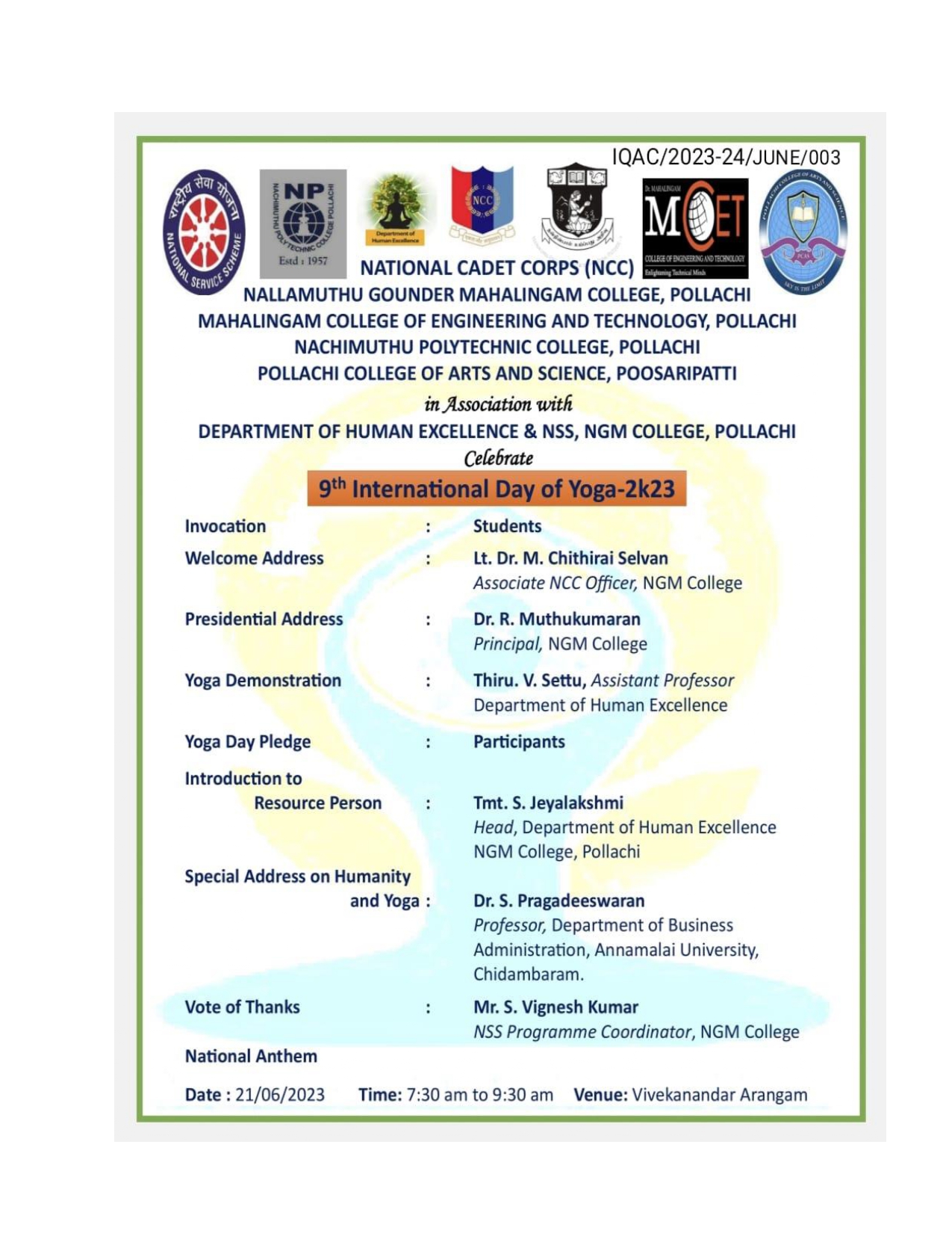 and Science, Poosaripatti, celebrated the 9th International Day of Yoga on June 21st, 2023 at