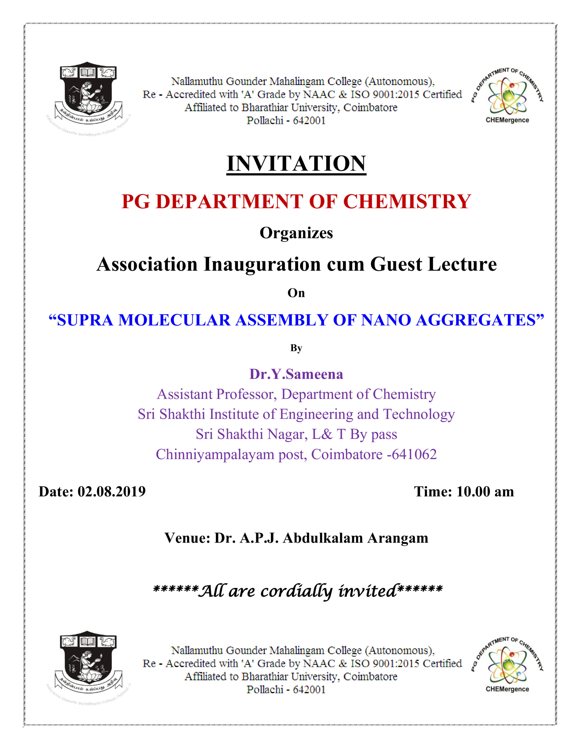 Association Inauguration cum Guest Lecture On “SUPRA MOLECULAR ASSEMBLY OF NANO AGGREGATES” and NGM chem HAND MADE HERBAL SOAPS” sale opening ceremony