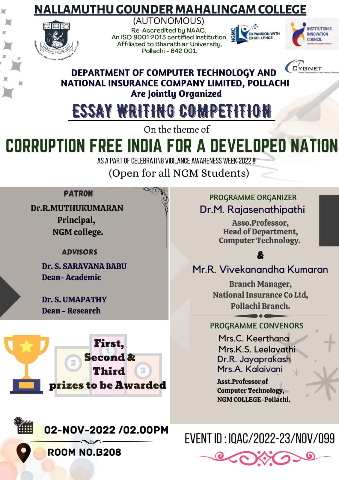 This is an Essay Writing Competition on the theme of “Corruption Free India for a Developed Nation” as a part of celebrating National Vigilance Awareness Week 2022 conducted for all NGM Students on 2.11.2022 for the part of provided Awareness on Vigilance and Corruption free. 32 Students were participated in this competition and they were got awareness about the objective, impact on Corruption Free India and what kind of methods used to make free Corruption among the students and Society people. The first 3 places were awarded by Principal and the Branch manager of National Insurance Company Limited, Pollachi.