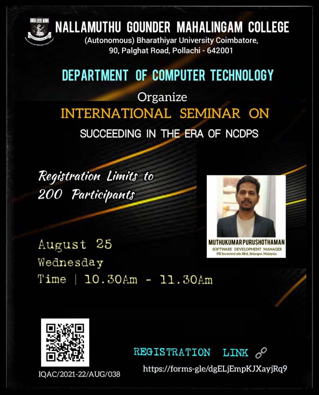 This is a International seminar about providing Evolution of programming Languages, Few NCDPS Tools, Software Development, Recruiters look for in freshers and good communication skills improvement to manage IT based company interviews. The speaker also shared information about how skills make the students outstanding for sure and also delivered the knowledge about current industry needs.