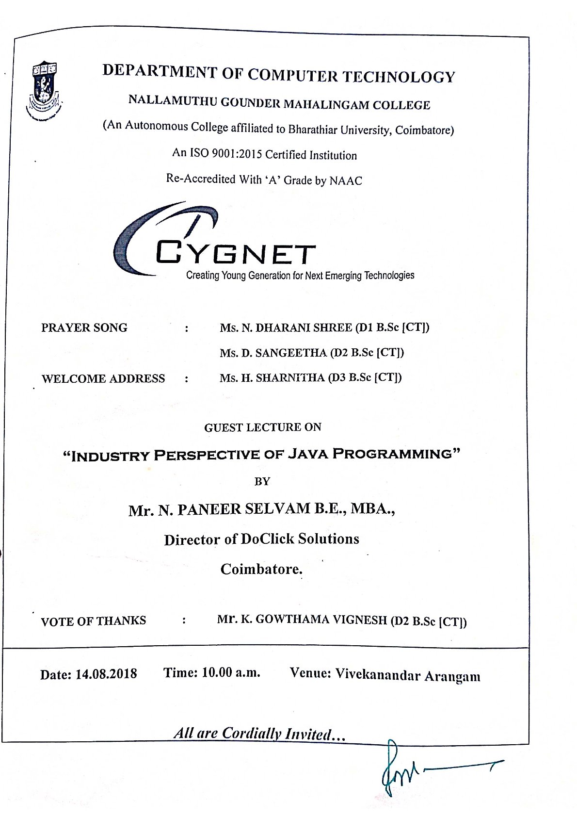 B.Sc., CT – Seminar on Industry Perspective of Java Programming – Aug 2018