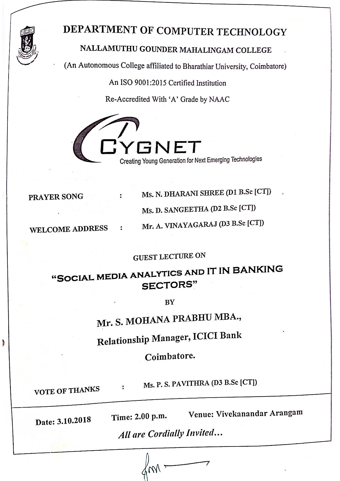 B.Sc., CT – Seminar on Social Media Analytics and It in Banking Sectors – Oct 2018