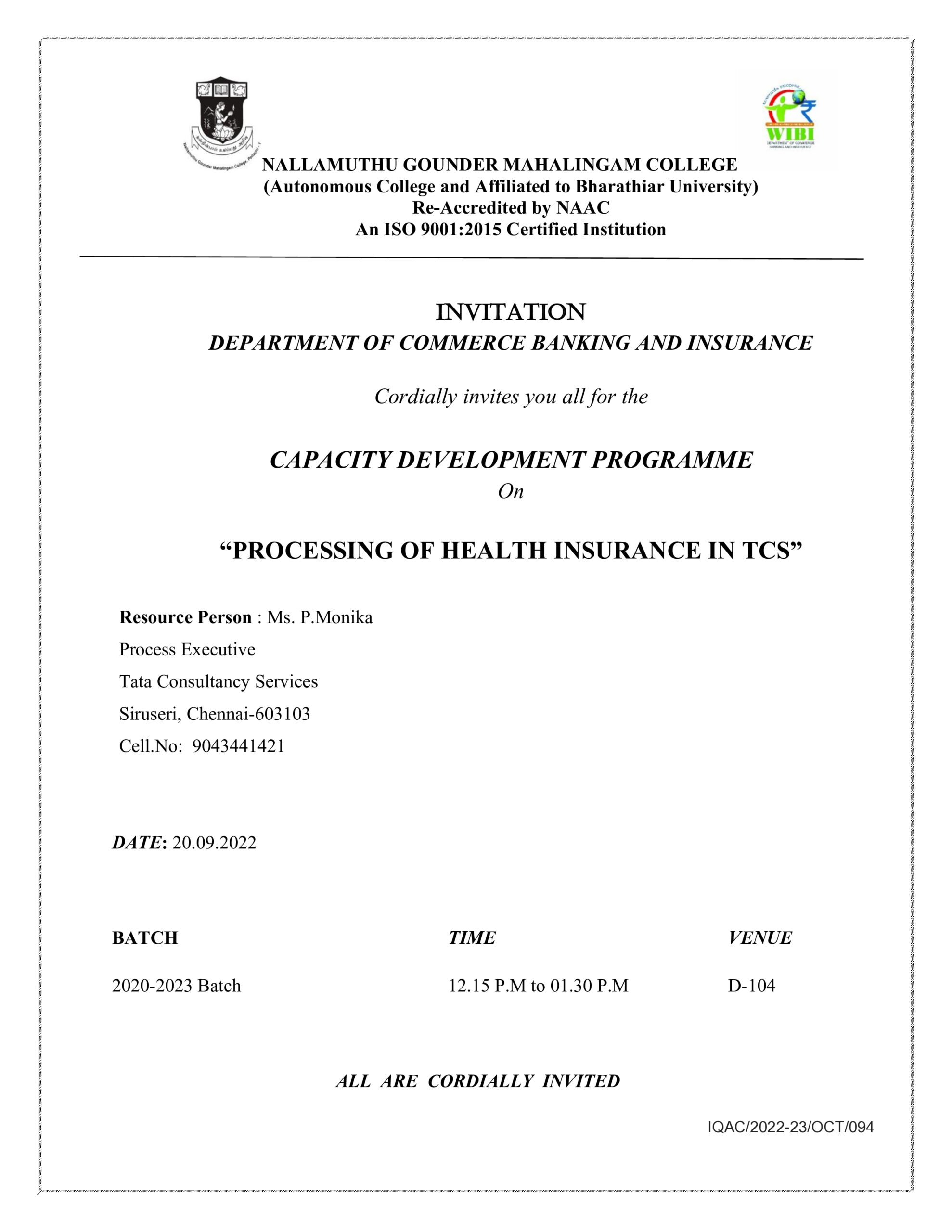 CAPACITY DEVELOPMENT PROGRAMME On “PROCESSING OF HEALTH INSURANCE IN TCS”