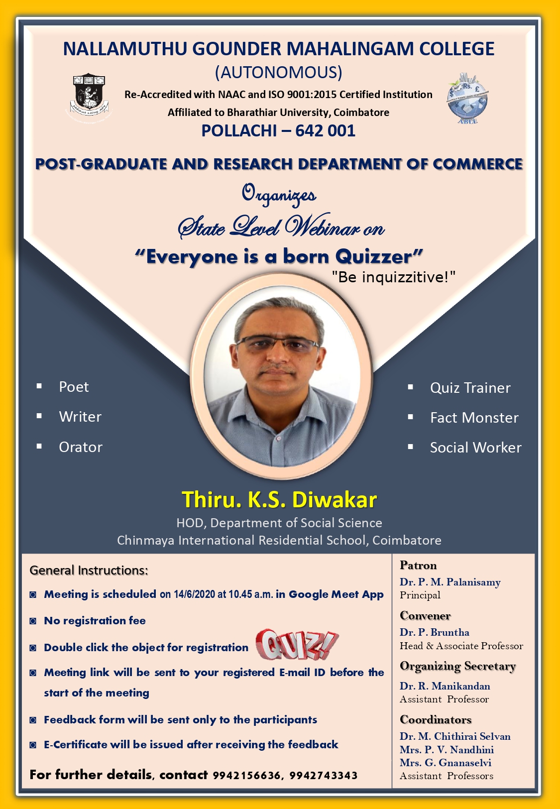 No registration fee .The State Level Webinar on “Everyone is a born Quizzer”! In this session, explore the diverse talents of individuals as poets, writers, orators, and more. Remember to stay curious and be inquizzitive! Our lineup includes quiz trainers, fact monsters, and social workers who was inspire you to embrace your inner quizzer. Get ready to unlock your potential and enjoy the journey of learning and discovery. Let’s dive in together!