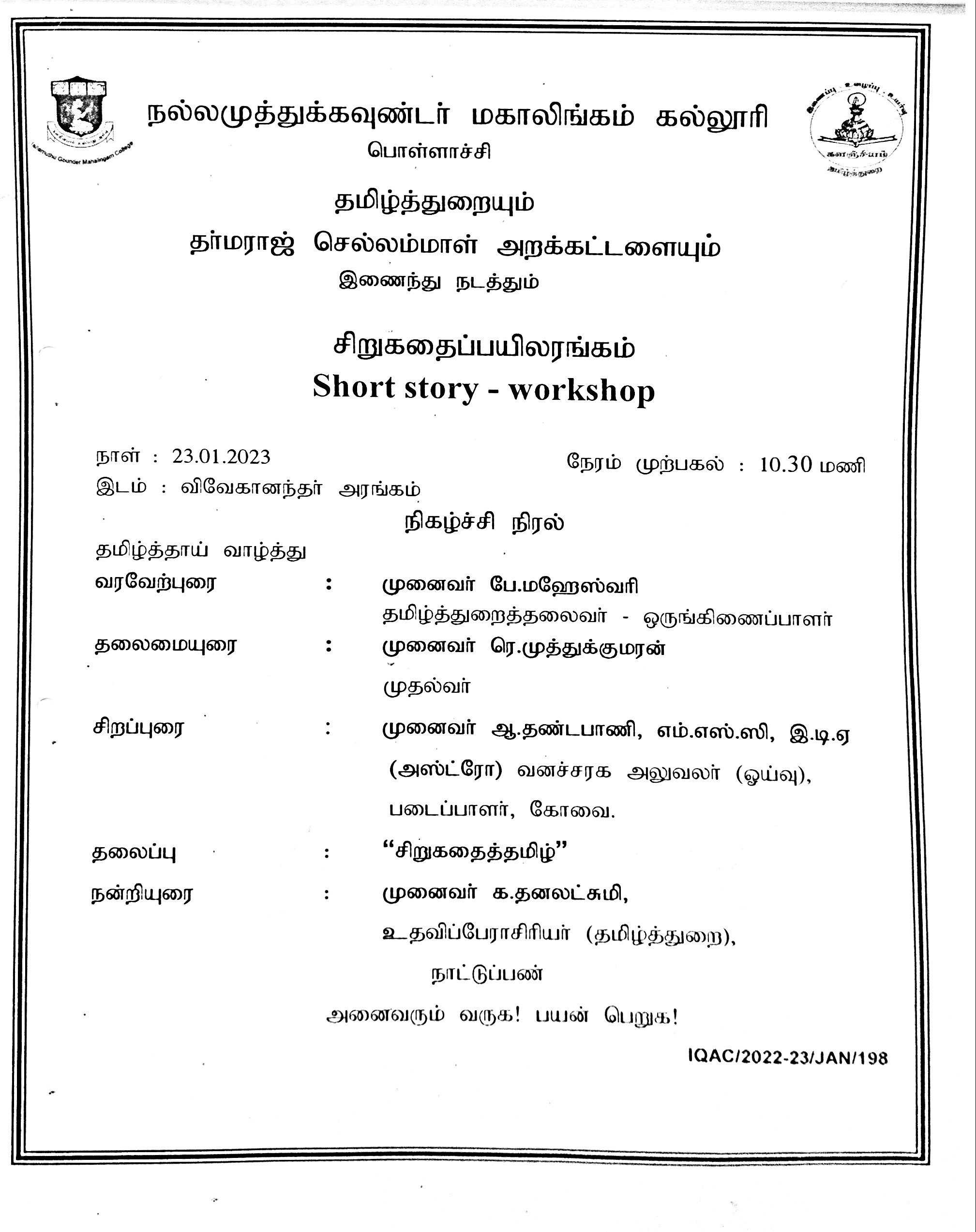 Department nof Tamil Language(Aided),Kalanjiyam,Shortstory – Workshop