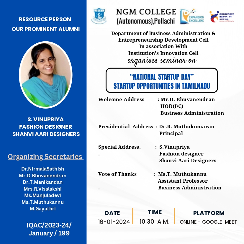 Department of Business Administration & Entrepreneurship Development Cell In association With Institution’s Innovation Cell OUR PROMINENT ALUMNI IQAC/2023-24/ January / 199 organises seminar on“NATIONAL STARTUP DAY” STARTUP OPPORTUNITIES IN TAMILNADU