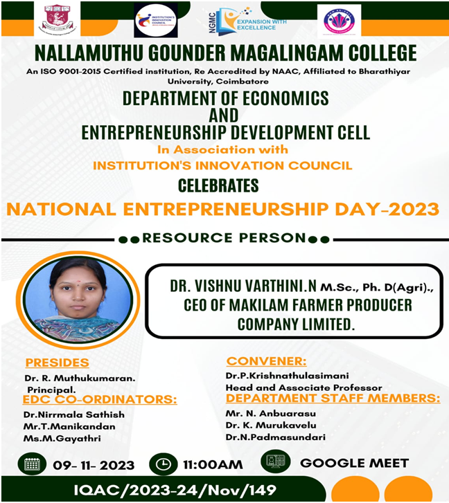 Department of Economics and Entrepreneurship Development Cell in association with Institution’s Innovation Council organized an online workshop on “Farming Business For Successful Entrepreneurship” on 09-11-2023 on account of celebrating National Entrepreneurship Day-2023