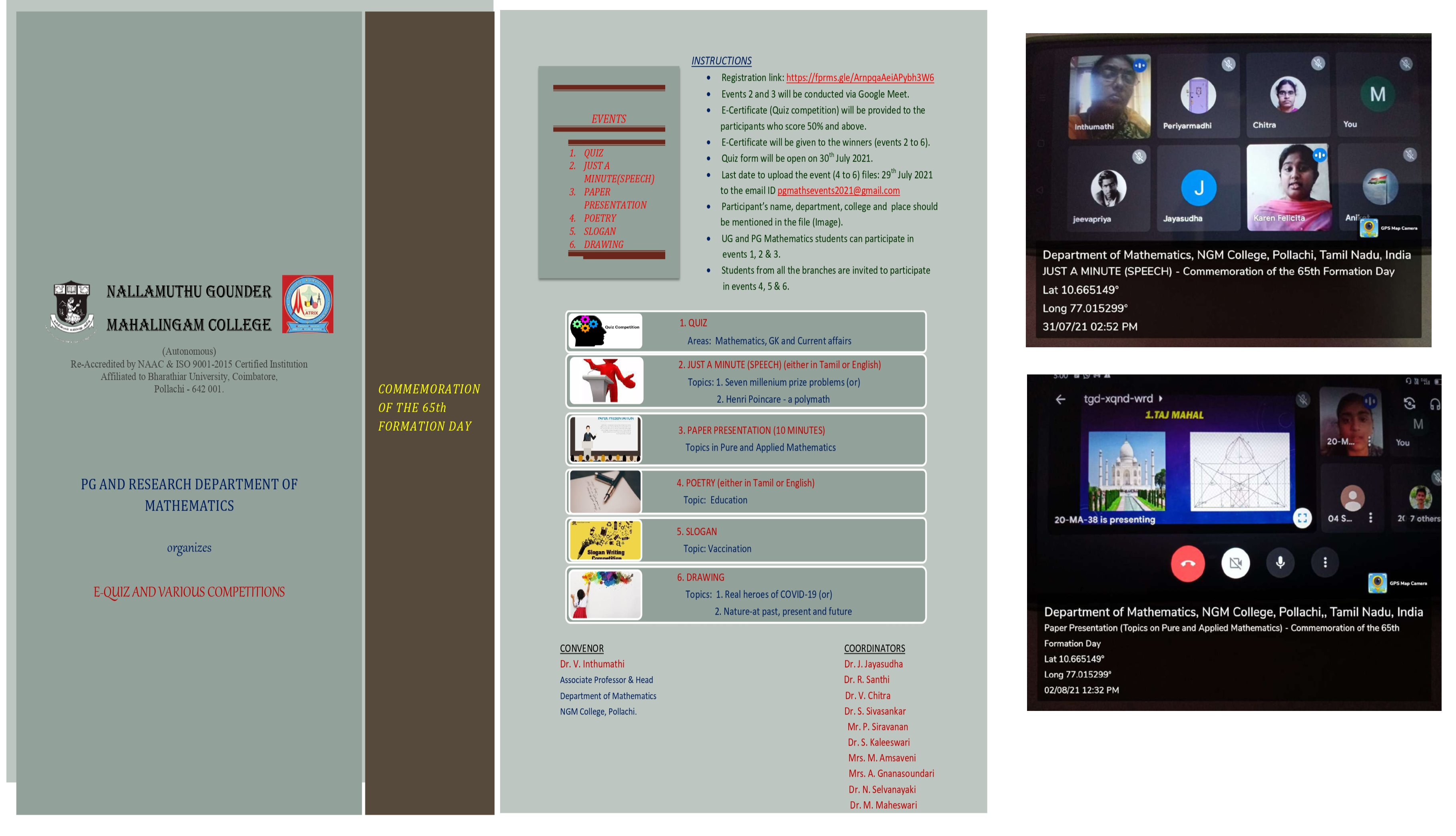 The Department of Mathematics conducting competitions motivate students to develop their talents and skills. Competing in math competitions is one way of exhibiting their talents. We have conduct various competitions like quiz, just a minute, poetry, drawing and paper presentation.