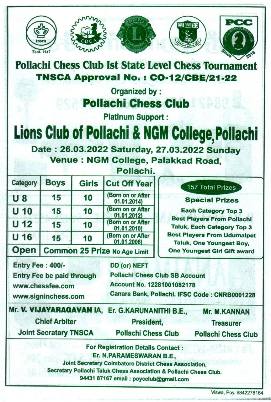 The Department of Physical Education has Organized State Level Chess Tournament at NGM College From 26.03.2022 to 27.03.2022.