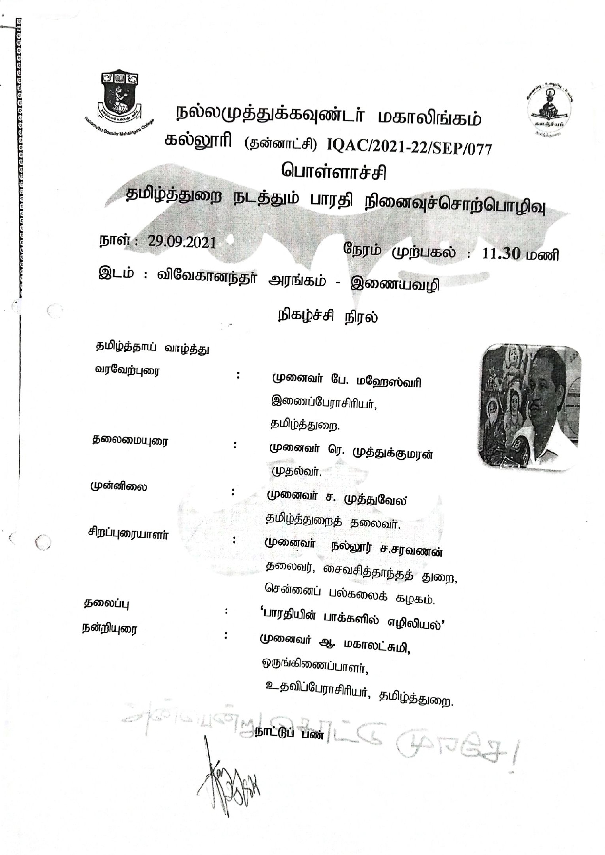 Dept of Tamil Language Aided,Kalanjiyam,Bharathi Ninaivu Sorrpozhivu.