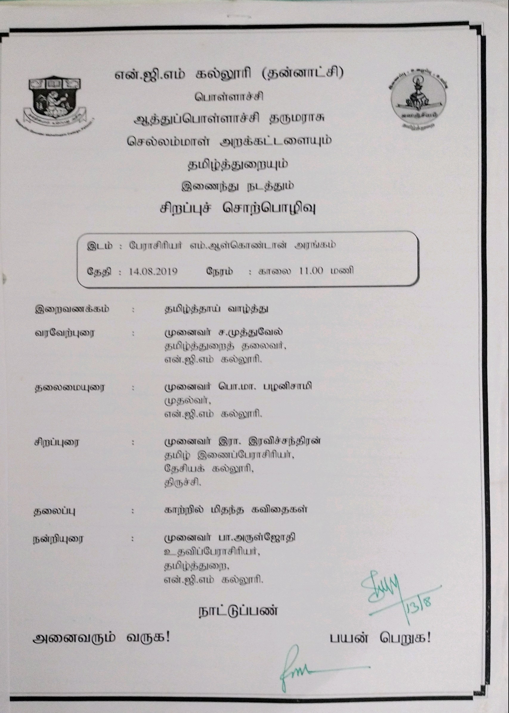 Athuppollachi Dharmaraju Chellammal Trust and Nallamuthu Gounder Mahalingam College Tamil Department jointly organized a special lecture at Arutselvar Arangam at 11.00 am on that day. Students participated in the event. Dr. R. Ravichandran, Associate Professor of Tamil, National College, Trichy. They were the chief guests and delivered a lecture on Poems Floating in the Wind.