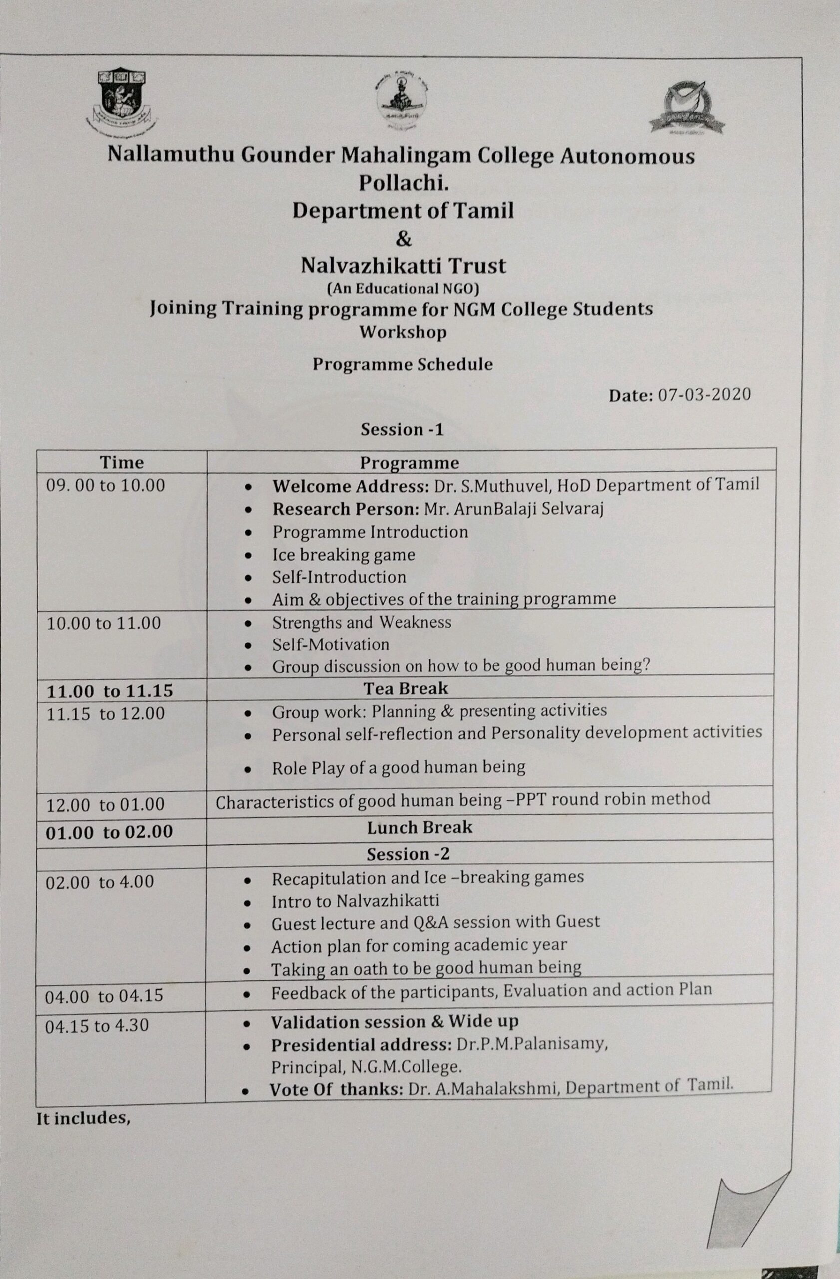 organized by the Tamil Department of Nallamuthu Gounder Mahalingam College and the Good Guide Organization. This course is; H.E. Mr. Arun Balaji, President of Good Guidance Organization and Selvi Soundarya, Secretary of the organization participated and imparted training to the students. A Memorandum of Understanding was signed between the two sides on this occasion. About 80 students participated and benefited in this function.