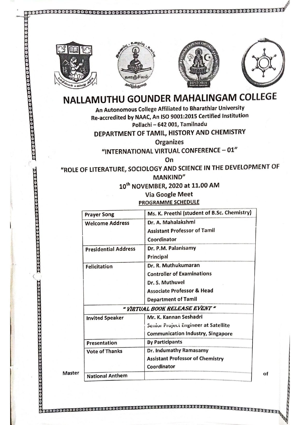 International Conference jointly organized by the Departments of Tamil, History and Chemistry.