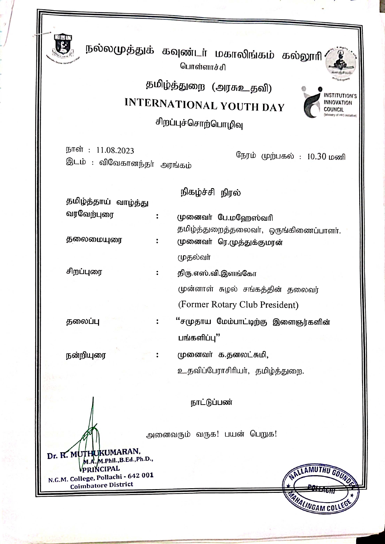 Tamil Department of Nallamuthu Gounder Mahalingam College delivered a special lecture for International Youthday -2023. The Principal of the college inaugurated and delivered the presidential address. Chief Guest Mr.S.V.Elango explained information Youth Contribution to Community Development .