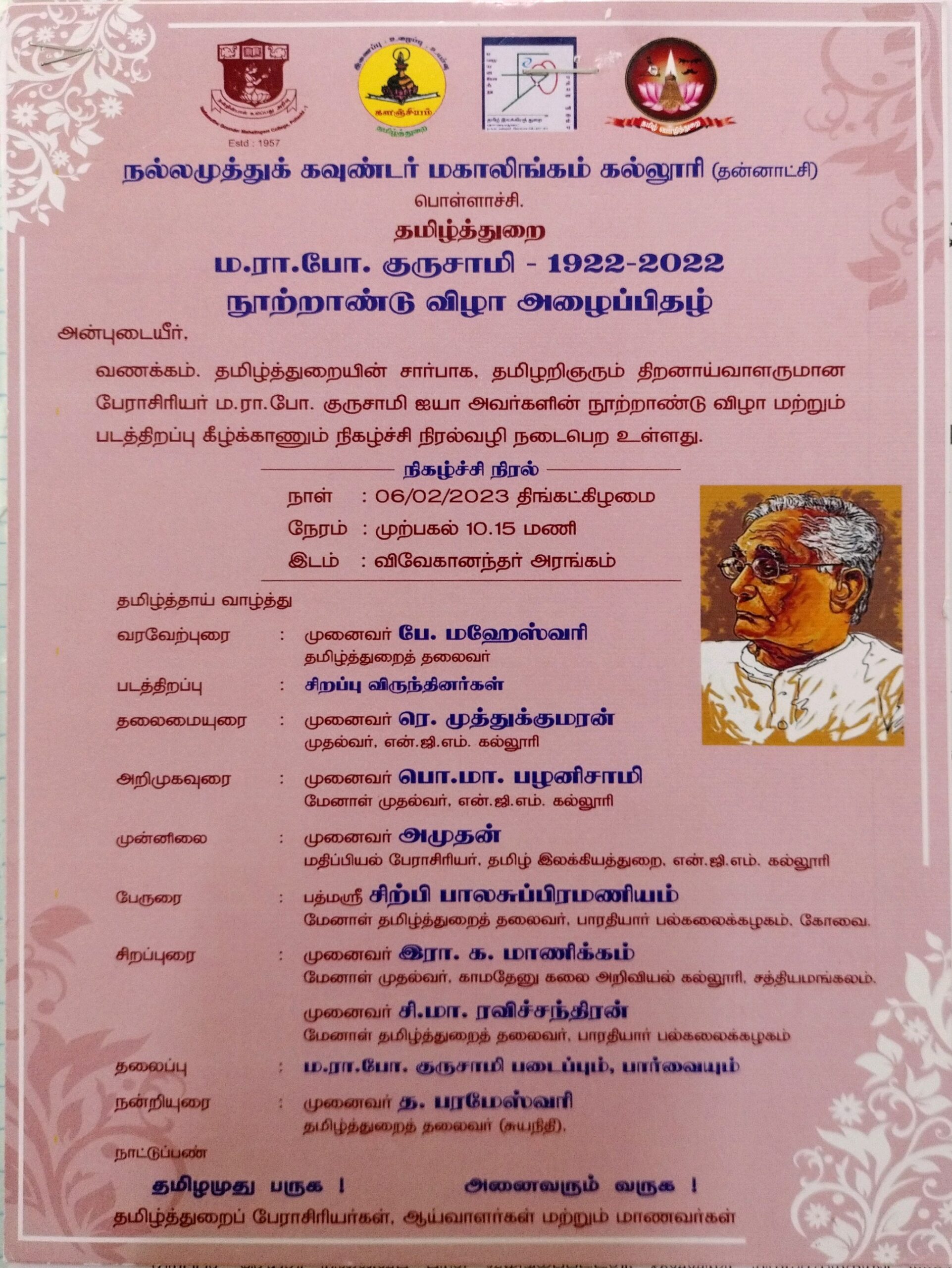 M.R.P.Gurusamy Centenary Celebrations Padma Shri Sculptor Balasubramaniam Former Head of Tamil Department, Bharathiar University (Coimbatore) delivered the keynote address. Dr. R.K. Manickam, Former Principal, Kamadhenu College of Arts and Science (Sathyamangalam) and Dr. C.M. Ravichandran, Former Head of Tamil Department, Bharathiar University (Coimbatore) delivered the keynote address.