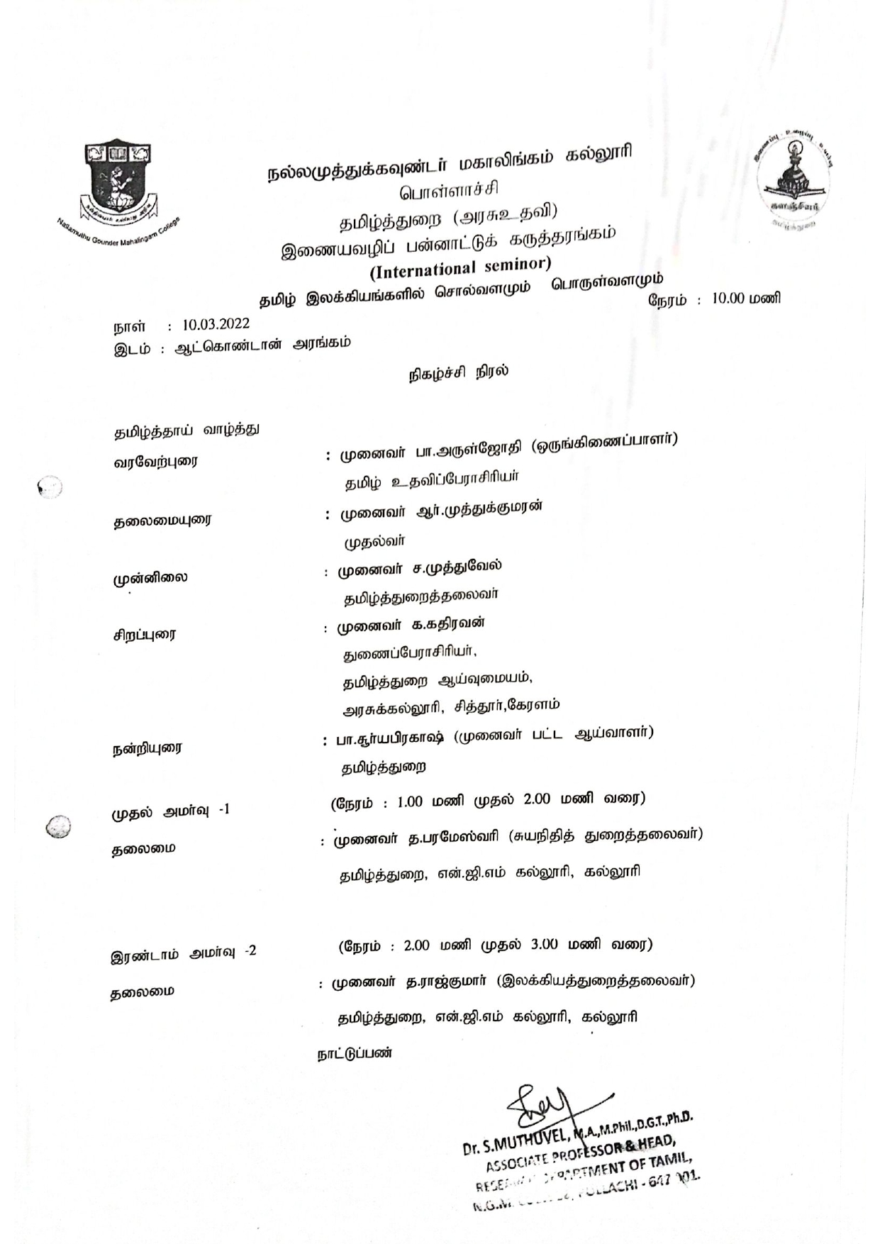 Department of Tamil Language(Aided),Kalanjiyam,Tamil Ilakkiyankalil Sollvalamum Porul Valamum Online International Seminar