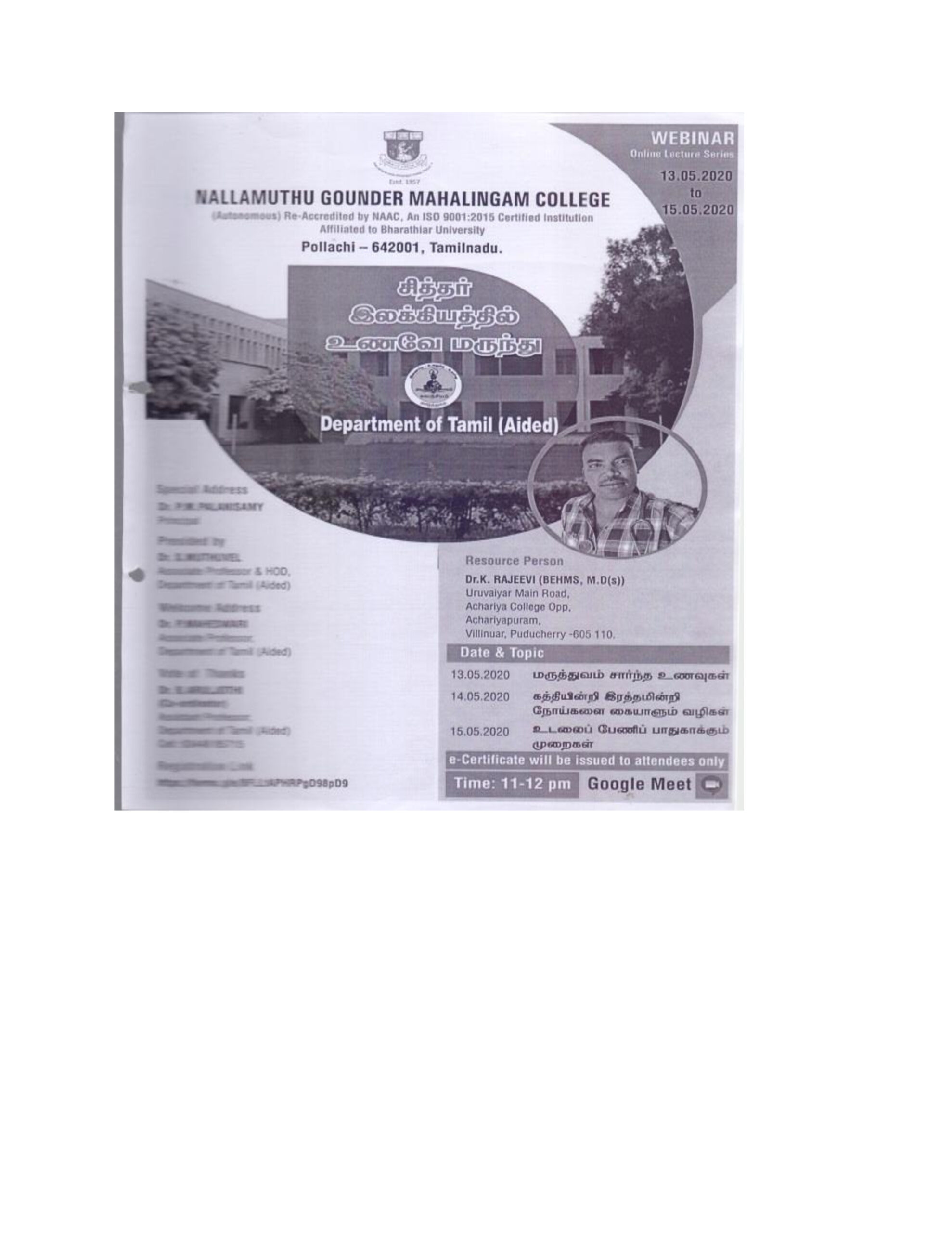 An online seminar on “Food is Medicine in Siddhar Literature” was conducted. Dr. K. Rajeev participated as the Chief Guest and spoke on the benefits and curative medicines of Siddha Medicine