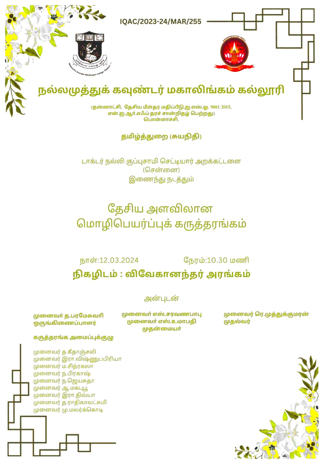 Dept of Tamil language-sf National level seminar on Mozhipeyarppu