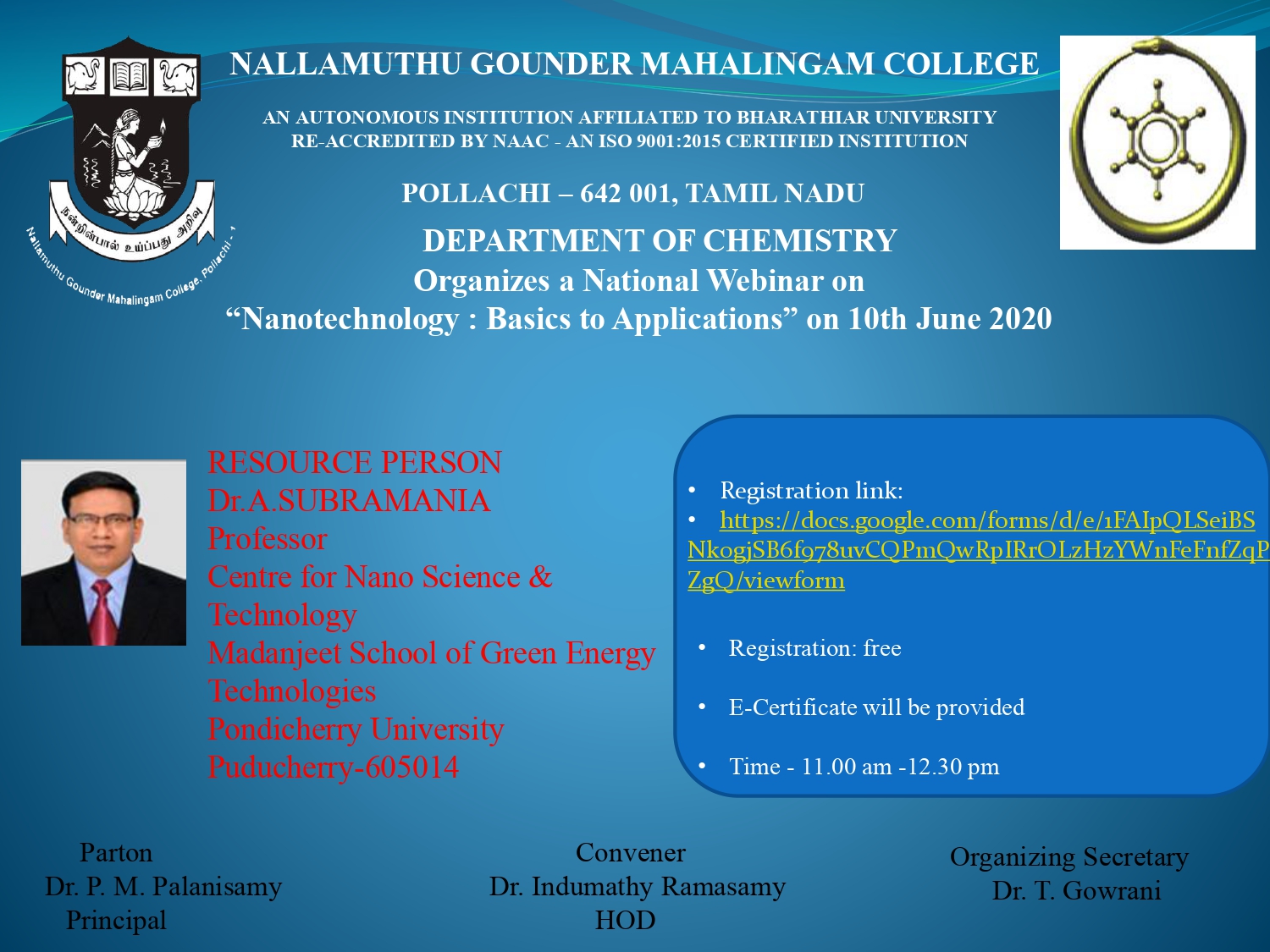 Prof.Dr.SubramaniaAngaiah, Pondichery University, Puducherry-605 014, India has been actively engaged in research and teaching in the area of Nanomaterials for Electrochemical Energy Conversion and Storage Devices. He did his Post Doctoral Research at KIST, Seoul, South Korea in the development of electrospun polymer membrane electrolytes for electrochemical energy storage devices such Lithium-ion batteries and DSSC. He has worked in the areas of Corrosion Inhibitors, Anti-corrosive paints, Water treatment, Gas sensors, Surface Engg., etc. He is a Fellow/Life Member of several academic societies. He has received several Scientific and Technological Achievement Awards which includes AICTE-Career Awards, UGC-BSR Mid-Career Award, PU-Best Teacher Award, CSIR-Best Technology Award, etc. He is an Associate Editor/Member of the Editorial Advisory Board/Editorial Board of several international journals. He has published more than 125 research articles in peer- reviewed journals with a citation index ~4553 (h-index 39), and also holds several patents in US, EU and India. He is the author of five National and one international books.