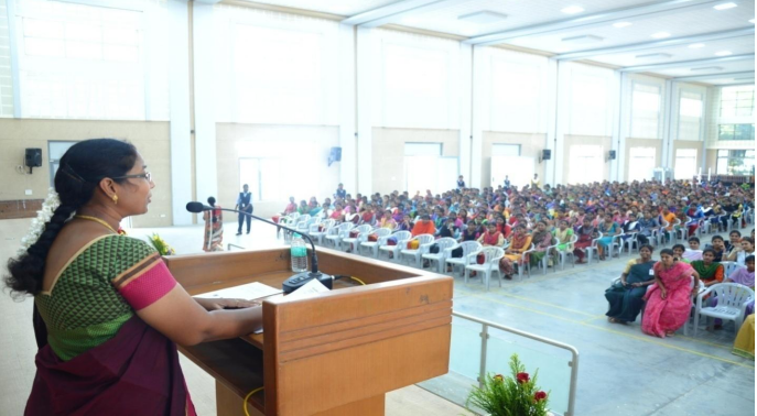 Ms.R. Anbuselvi B.Sc.,B.L. M.B.A.,PGDCA. Advocate, Pollachi delivering a speech on the topic ” Emancipation of Women”on 19.02.2019 for session – II