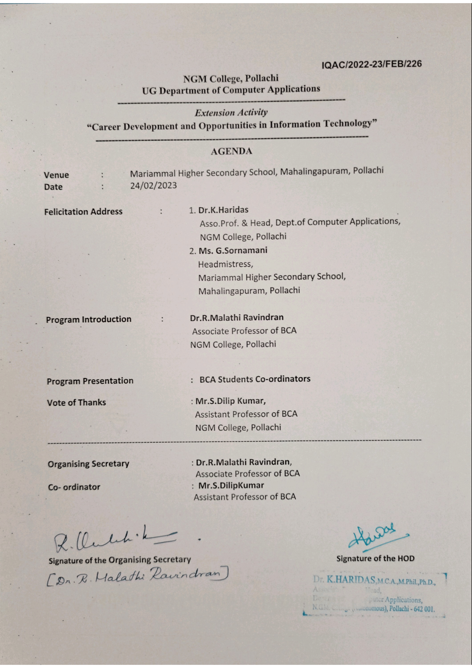 Dr.K. Haridas, Head & Associate Professor of BCA, Dr.R. Malathi Ravindran, Associate Professor of BCA, Mr.S. Dilip Kumar, Assistant Professor of BCA
