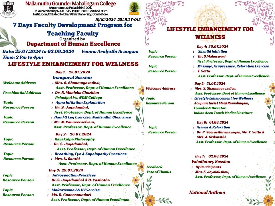 The Department of Human Excellence at NGM College organized a 7-day Faculty Development Programme titled “Yoga for Emotional Stability” from July 25 to August 2, 2024, aimed at enhancing emotional stability and overall well-being among faculty members through yoga.