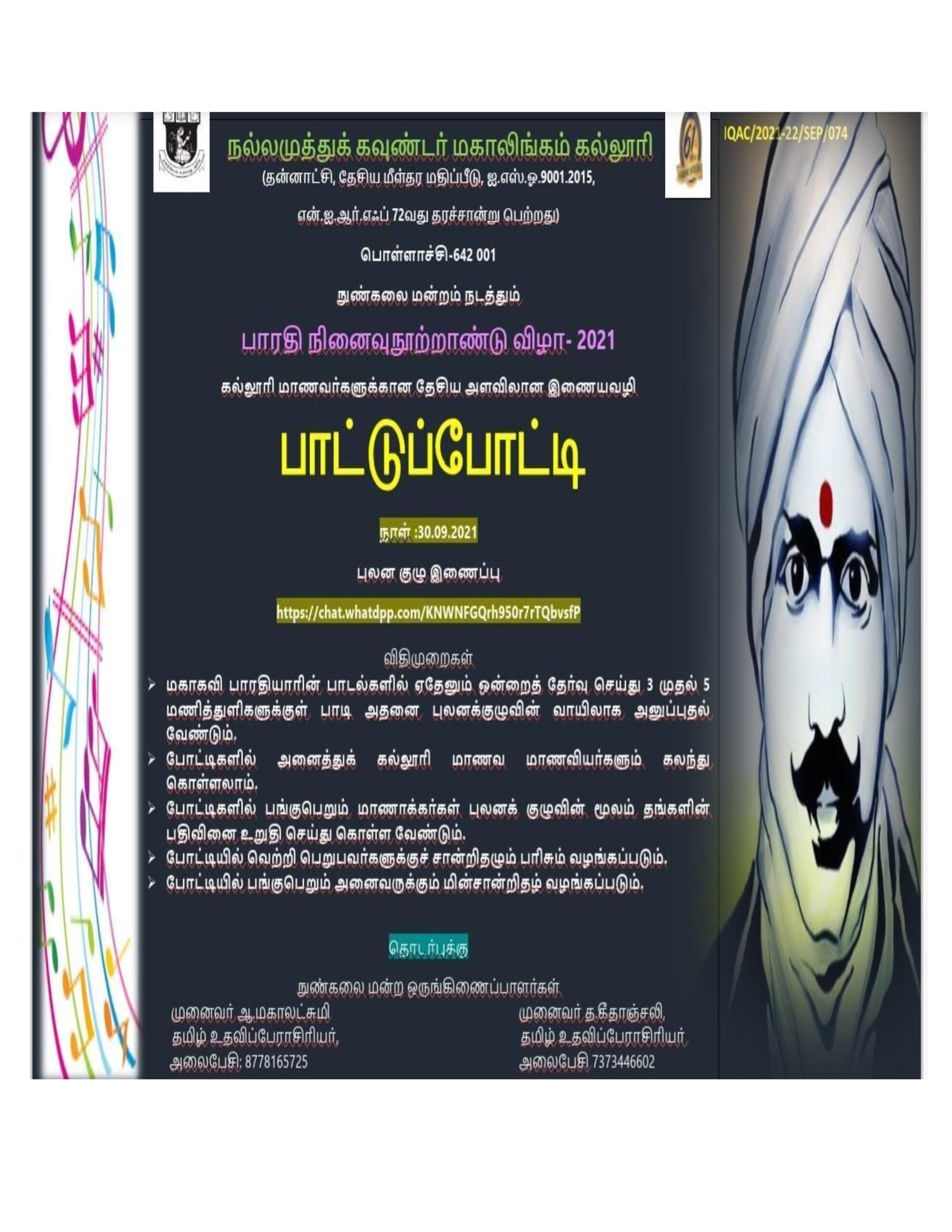 National Standard Online Course for College Students Three days were held from 30.09.2021. 12 students participated in the competition and sang Bharatiyar songs. Certificate of Appreciation for participants; were provided.
