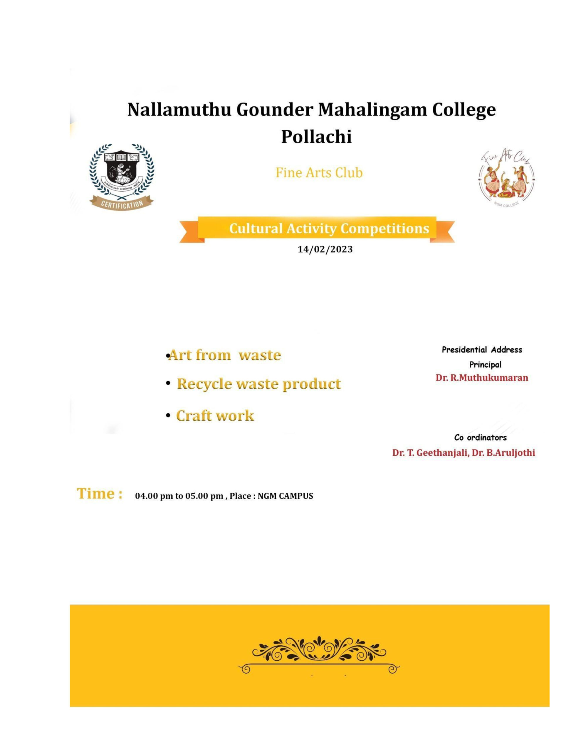 A college-level craft and recycling initiative for college students; s held on 14.02.2023. 25 students participated in the competition; They showed different abilities. Winning parents were awarded certificates and participants were awarded certificates of appreciation.