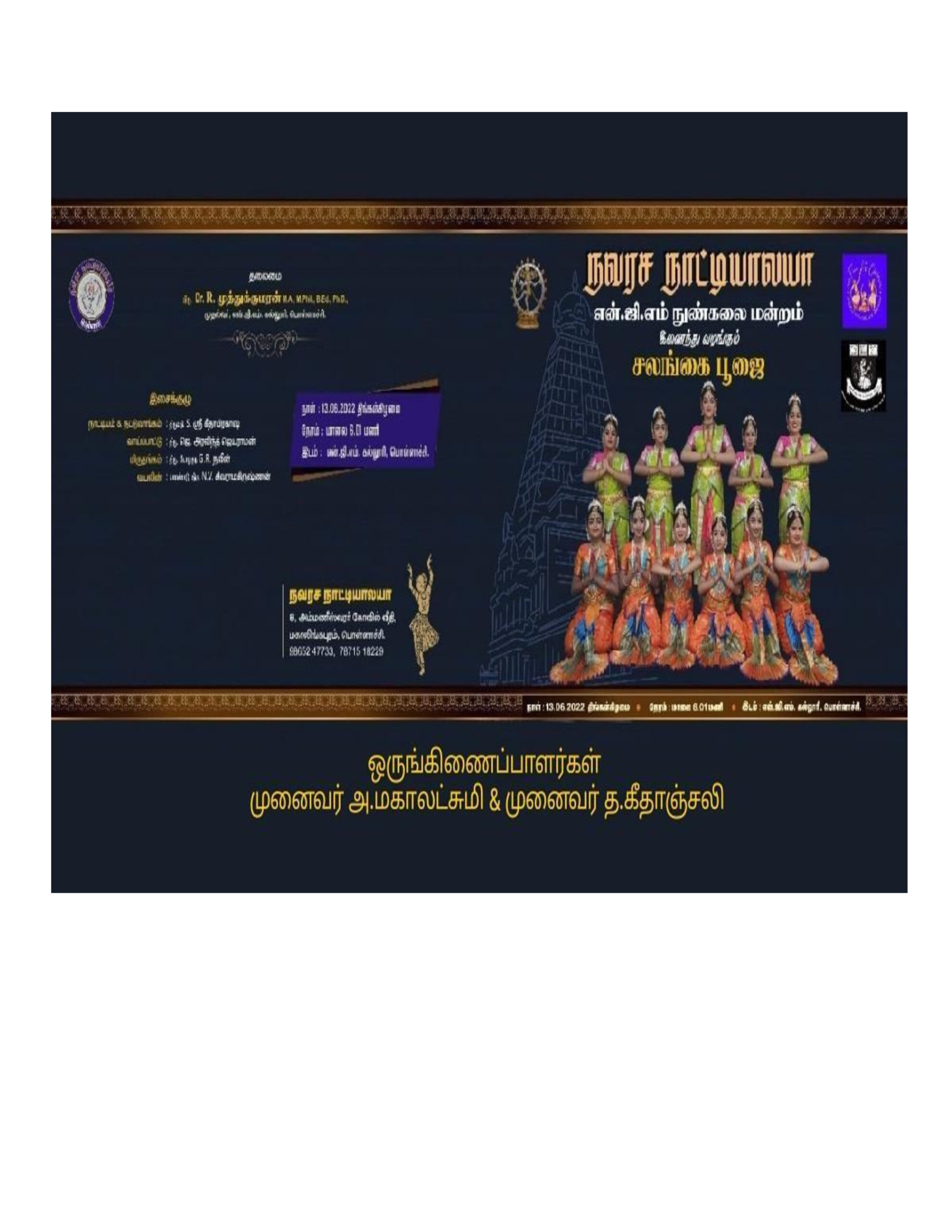 Salanga Puja jointly organized by Pollachi Natyalaya and Nunak Lai Forum was held on 13.06.2022. 150 students participated in the competition and showed their skills. 600 people participated in the event