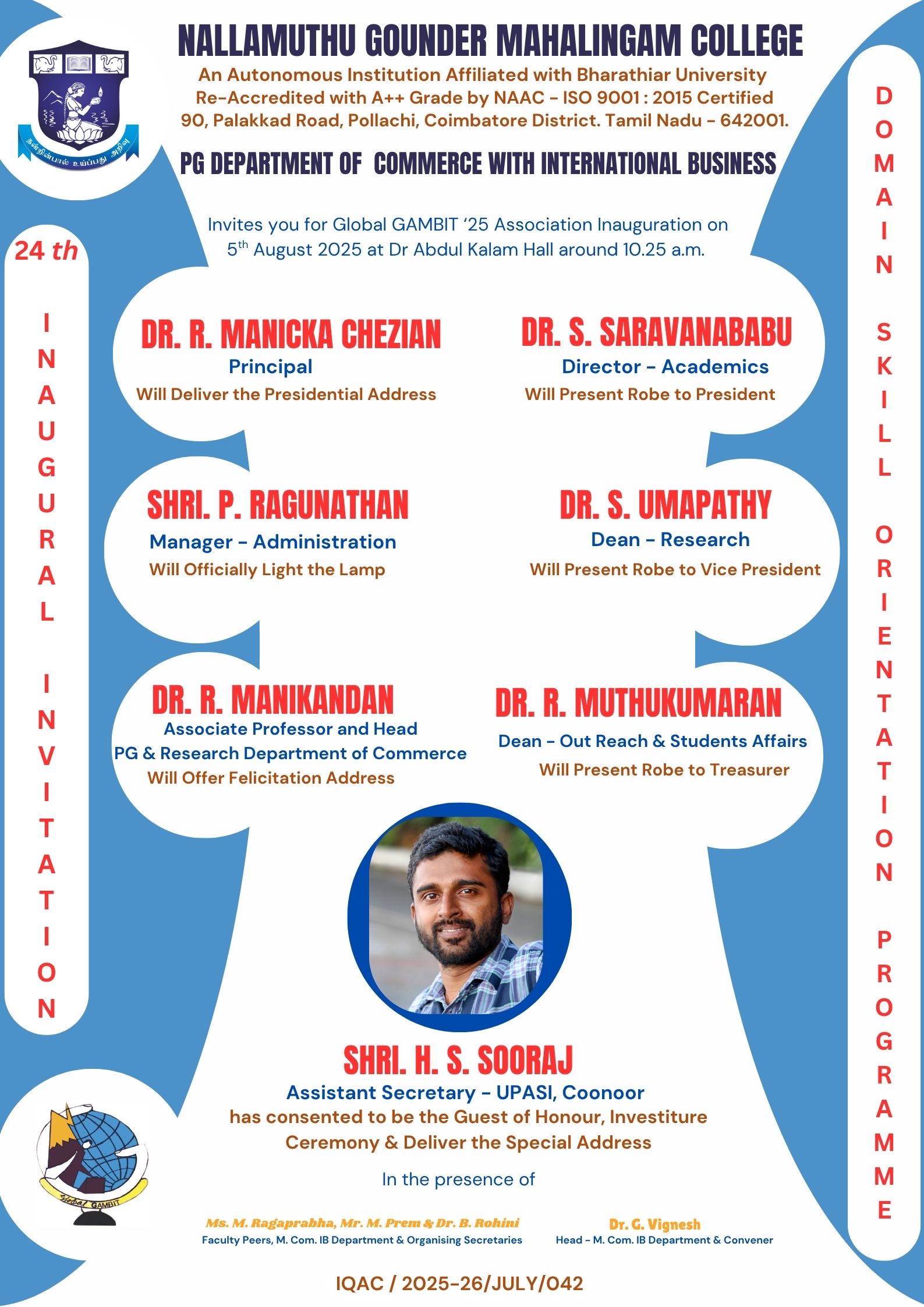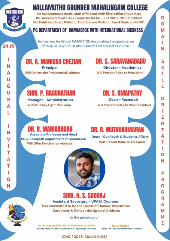 PG Department of Commerce and International Business have Inaugurated the Global GAMBIT association for the academic year 2025 – 2026 .Robes were distributed to the office bearers and Five Statutory Commodity Board were discussed by the resource person.