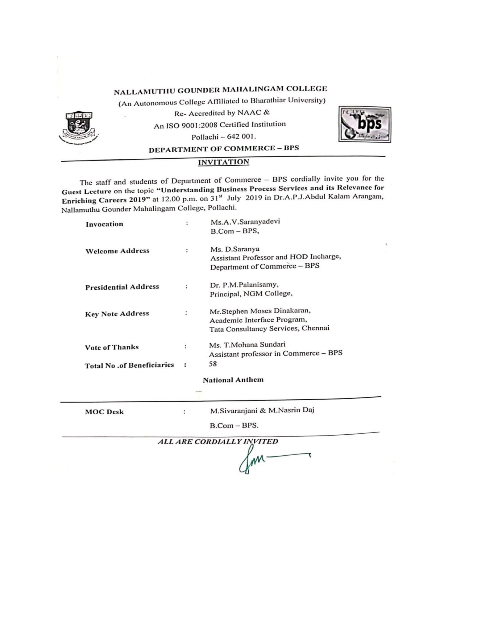 Department of Commerce-BPS organized a Guest Lecture on “Understanding Business Process Services and its relevance for Enriching Careers 2019” on 31.07.2019 at 12.00 pm through offline mode in Dr.Abdulkalam Hall. The resource person Mr.Stephen Moses Dinakaran, Academic Interface programme, TCS, Chennai.