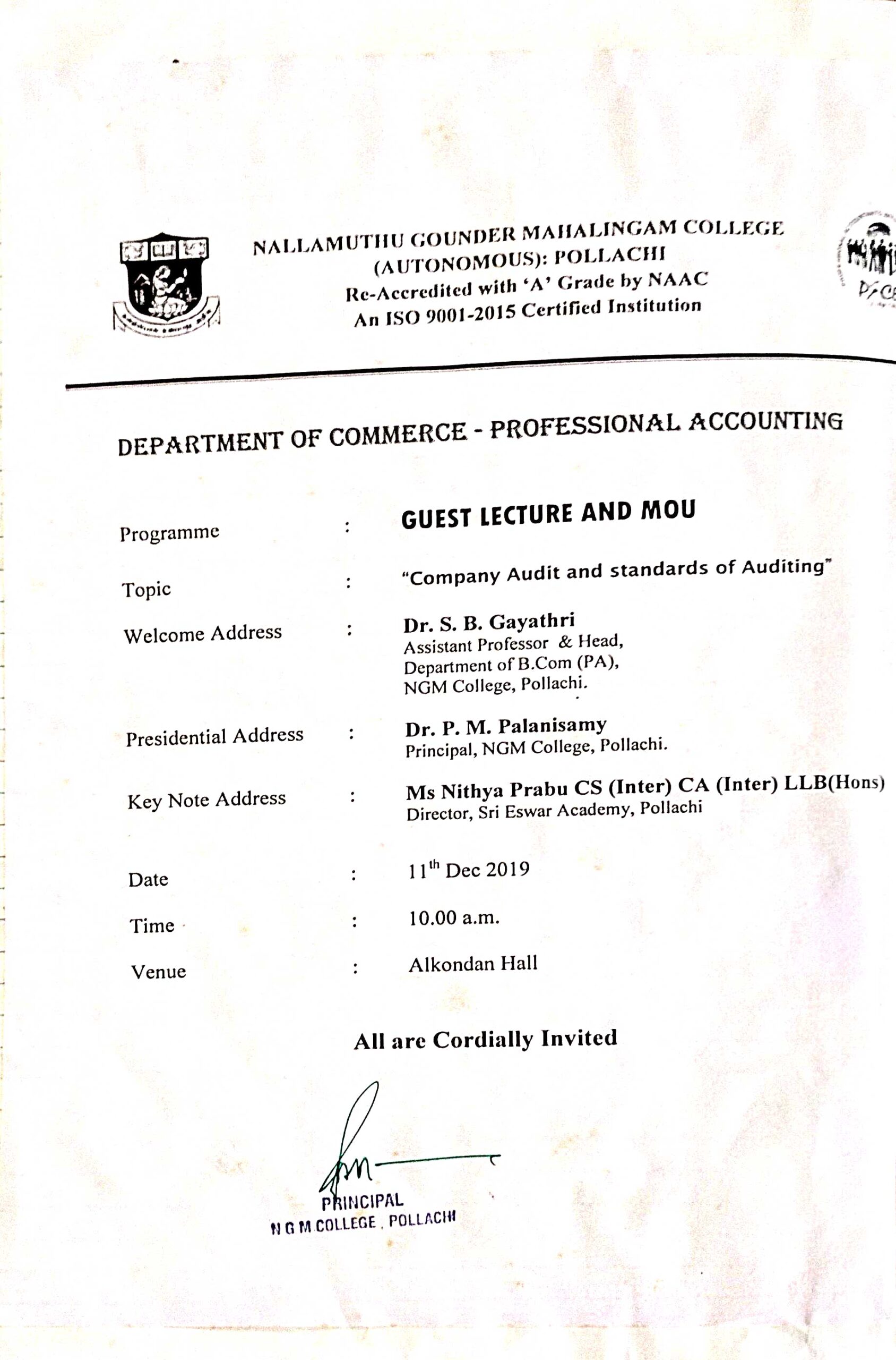 The Department of Commerce – Professional Accounting has conducted a guest lecture program on Company Audit and standards of Auditing on 11.12.2019. The resource person was Ms. Nithya Prabu CS (Inter) CA (Inter) LLB (Hons) Director Sri Eswar Academy Pollachi. She has clearly explained about the Company Audit and standards of Auditing to the students .