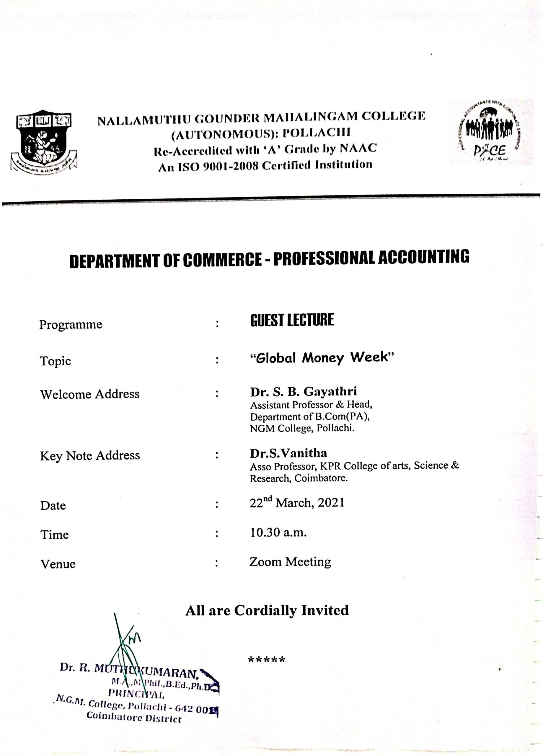 The Department of Commerce – Professional Accounting has conducted a guest lecture program on “Global Money week’’ on 22.03.2021. The resource person was Dr. S. Vanitha, Associate Professor School of Management KPR College of Arts, Science & Research, Cbe.