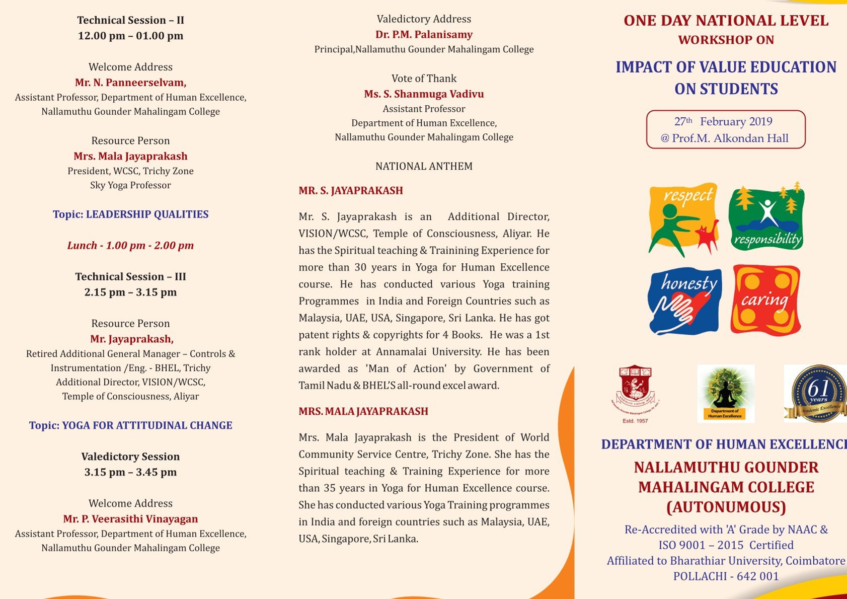 One Day National Level workshop on “Impact of Value Education on Students” was conducted by the Department of Human Excellence on 27th February 2019 at NGM College, Pollachi. Above 150 Students are benefited by this program.