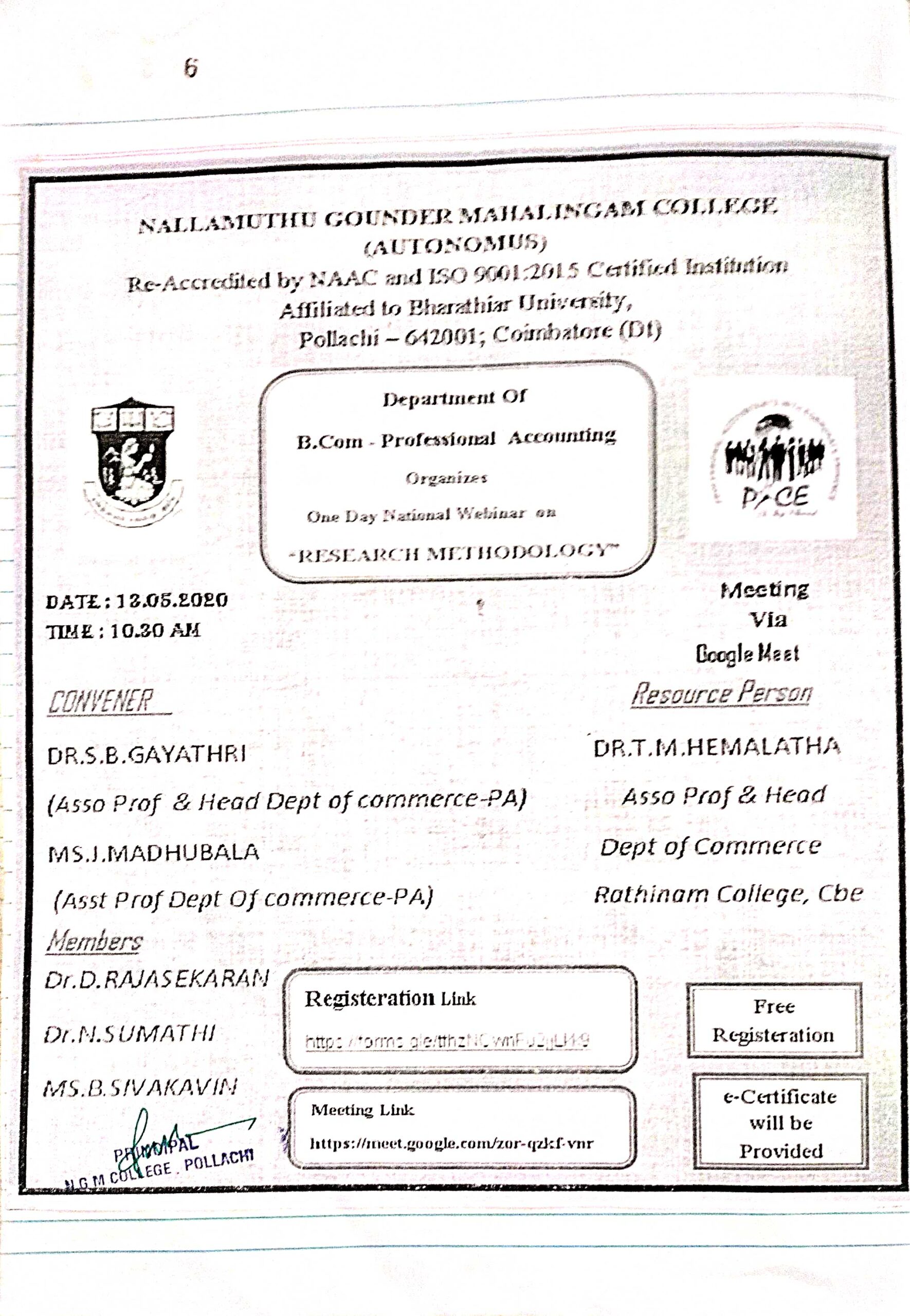 The Department of Commerce – Professional Accounting has conducted One day National Webinar on Research Methodology on 13.05.2020. The resource person was Dr. T.M.Hemalatha Asso prof& Head Dept of Commerce Rathinam College, Cbe.