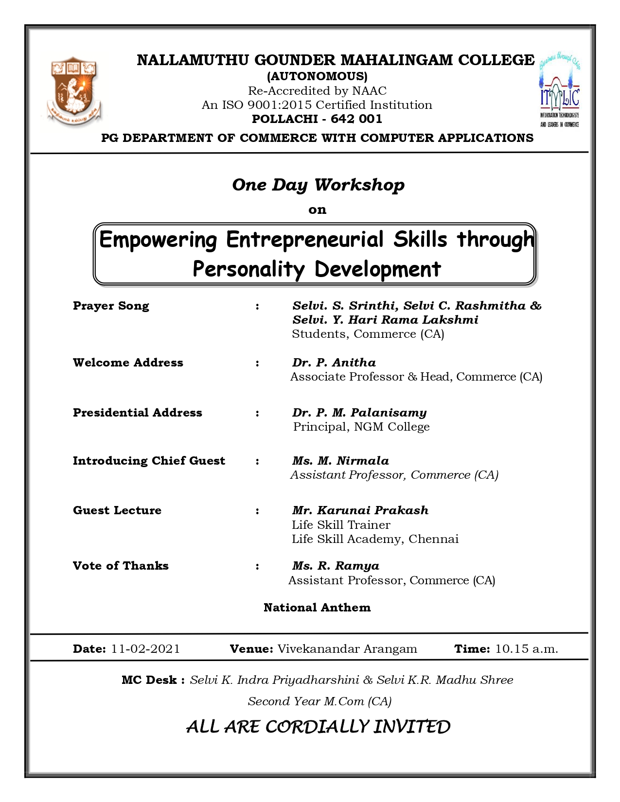 One Day Workshop on Empowering Entrepreneurial Skills through Personality Development 2021