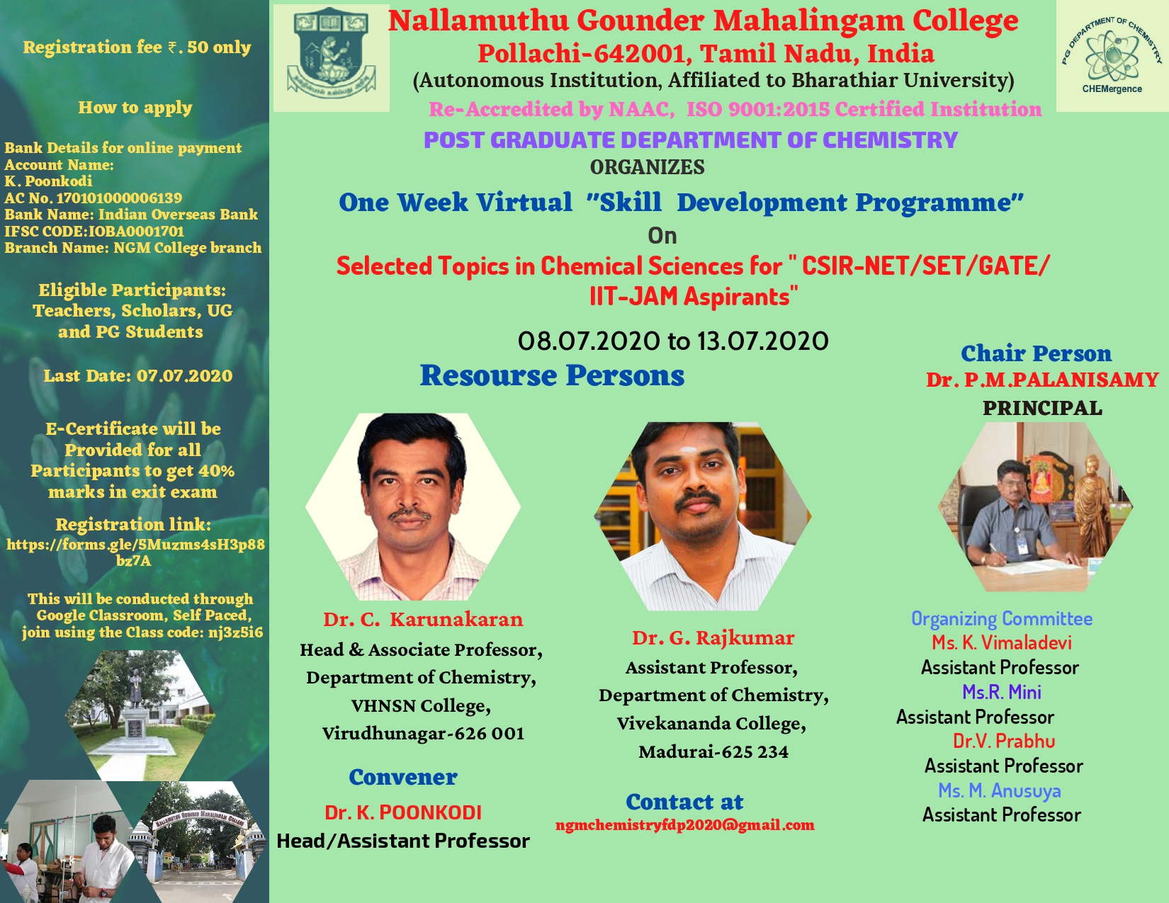 One Week Virtual “Skill Development Programme” on Selected Topics in Chemical Sciences for ” CSIR-NET/SET/GATE/ IIT-JAM Aspirants”