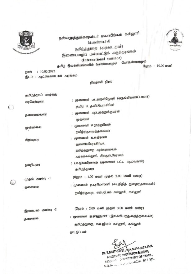 Nallamuthu Gounder Mahalingam College conducted an online seminar on Vocabulary and Material Resources in Tamil Literature. Dr. K. Kathiravan, Assistant Professor, Centre for Tamil Studies, Government College, Chittoor, Kerala participated as the chief guest and explained various information.