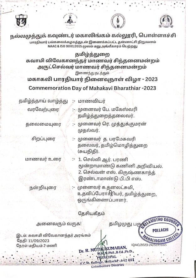 Bharathi Memorial Lecture conducted by the Tamil Department & Swamy Vivekanandhar Maanavar Sinthanai Mandram & Arutchelvar Maanavar Sinthanai Mandram was held on Vivekanandhar Arangam. Selvi.R.Barani,3rd Year Computer Science & Selvan.S.Krishnaganth,2nd Year B.P.S Students gave lectures on Mahakavi Bharathiyar