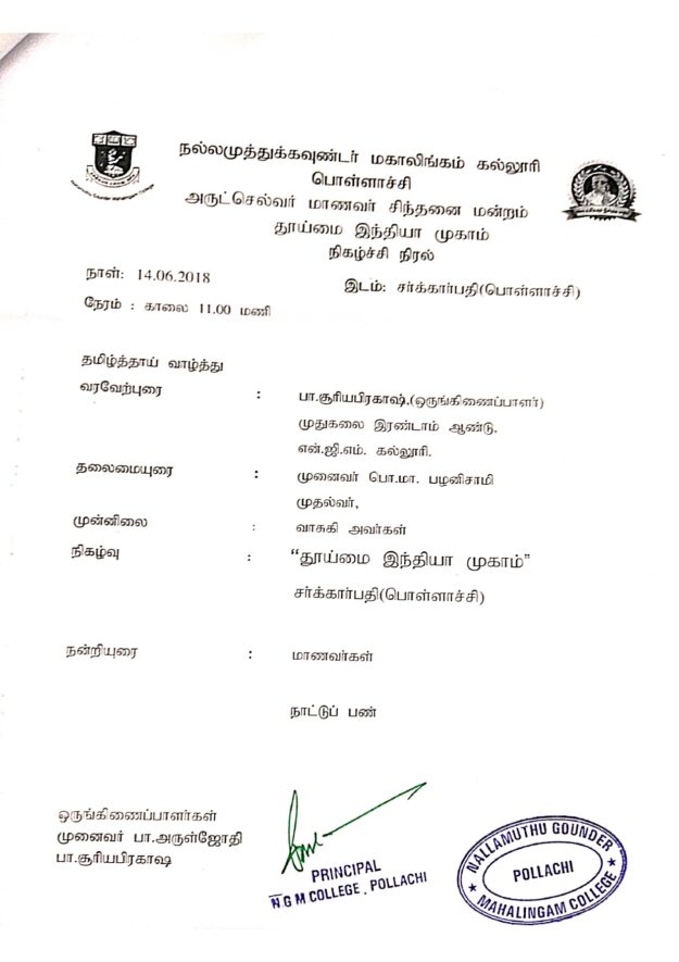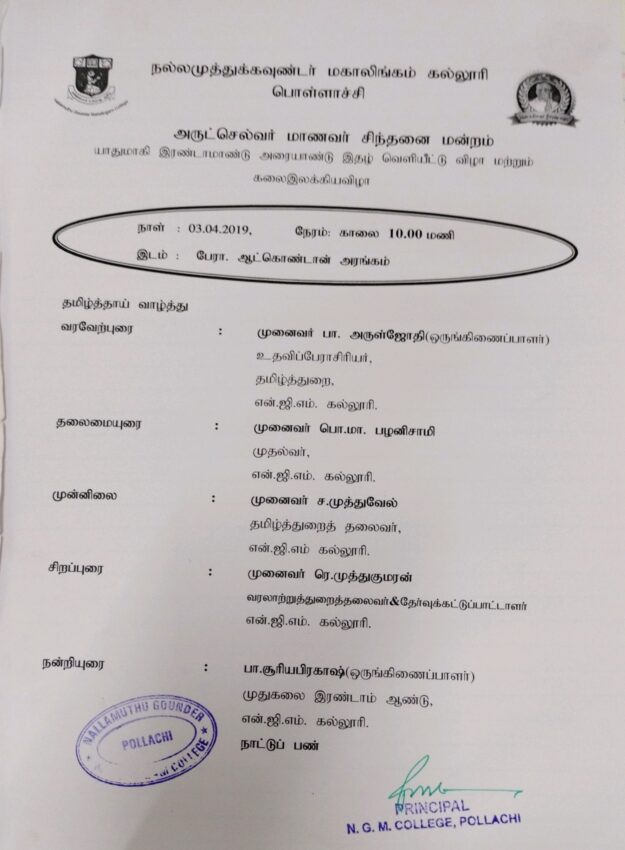 03.04.2019 – In order to bring out the individual talents of the students, solo dances, yoga lectures etc. were conducted. Arutselvar Manavar Sindhanai Mandram of the second year, Yadumagi Book was published. A collection of students’ works was given a special address by the Principal of our college.