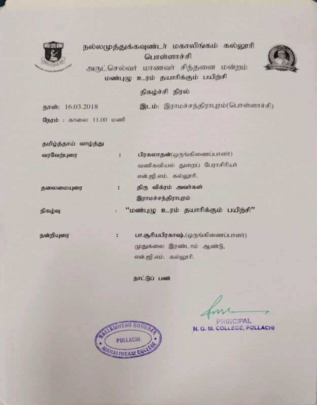 Recent techniques in vermicompost preparation – 16.03.2018 The students learned about the vermicompost preparation in the garden of Vikram Muthuratnam Sabari, an organic farmer belonging to the land. They got to know the importance and benefits of vermicompost in agriculture. About 20 students participated in this exercise.