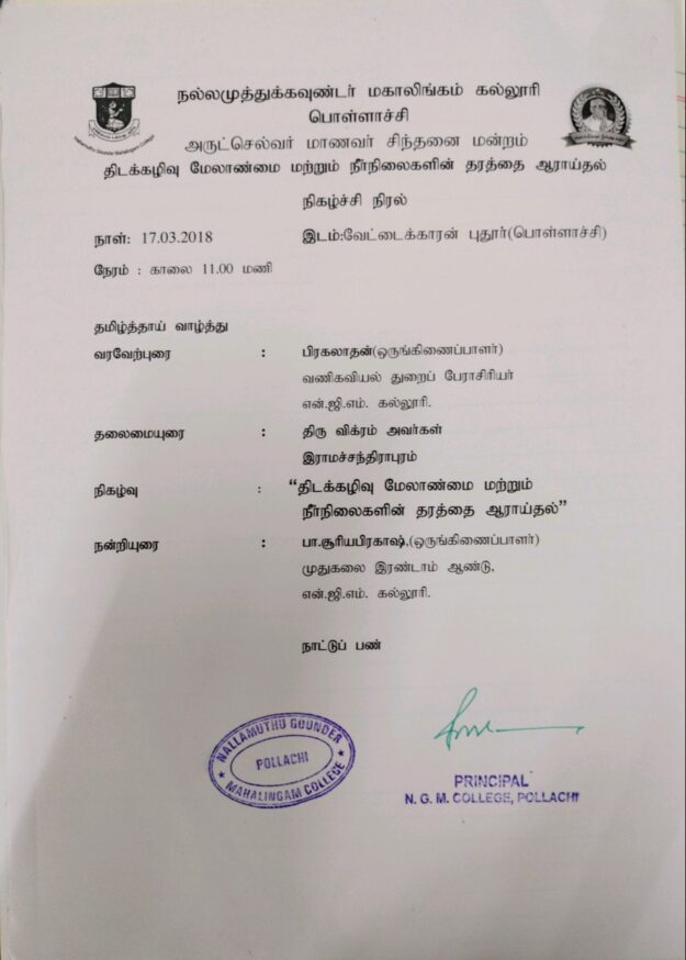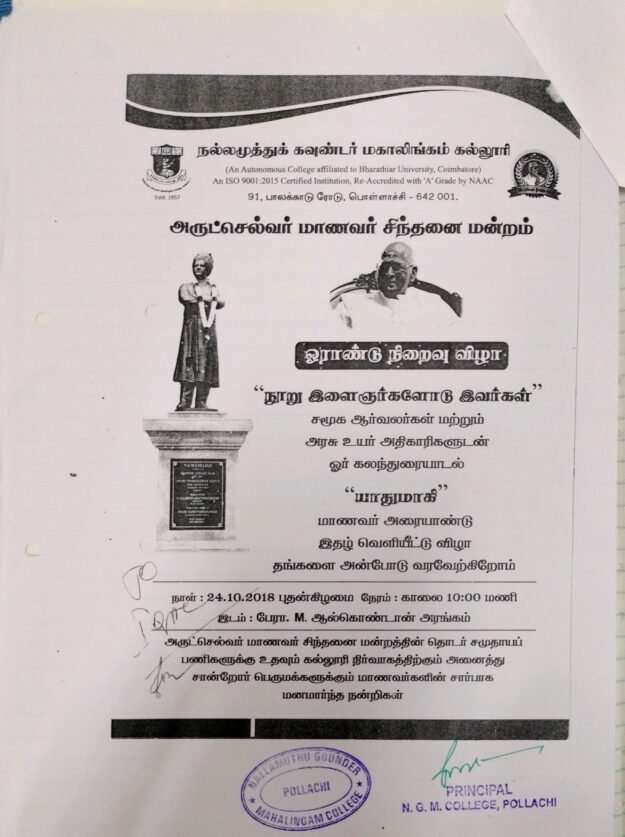 24.10.2018 – A collection of poetry, painting and commentaries of college students titled Yadumagi was published at the anniversary function of Arutselvar Manavar Sindhanai Mandram.