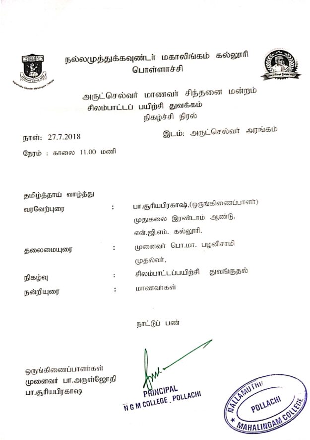 27.07.2018 -In the annual function organized by the sports department in the college, the Silambatam training course was started and many people from various fields participated and benefited from this training course.