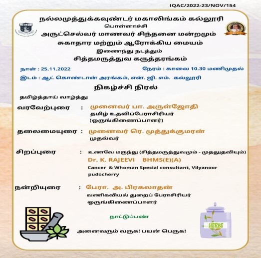 25/11/2022 A seminar was held on the topic “Food is Medicine” in which Siddha doctor Dr.K. Rajeevi Cancer & Women’s Special Consultant advised the students on the daily diet and the treatment to be followed in case of illness.