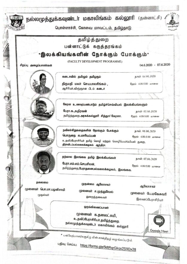ourses”Tamil and Tamils in Canada”; Mrs. Malar Jeyabalasingham, Faculty of Science, Canada. 2. “Kerala Food Culture and Tamil Classical Literature” Prof.K.Kathiravan, Department of Tamil, Government College, Chittoor Kerala. 3. “Perspectives and Trends of Modern Short Stories” Porunai K. Mariappan, Assistant Professor, Department of Tamil Language and Translation, Dravidian University. 4. “Contemporary Sri…
