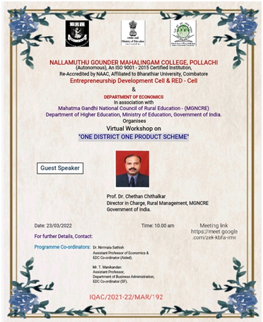 Entrepreneurship Development Cell (EDC), Nallamuthu Gounder Mahalingam College, (Autonomous), Pollachi – 642 001, in association with Mahatma Gandhi National Council of Rural Education Department of Higher Education, Ministry of Education, Government of India had jointly organized a programme on “One District One Product Scheme.” for the benefit of students, research scholars and faculty members on…