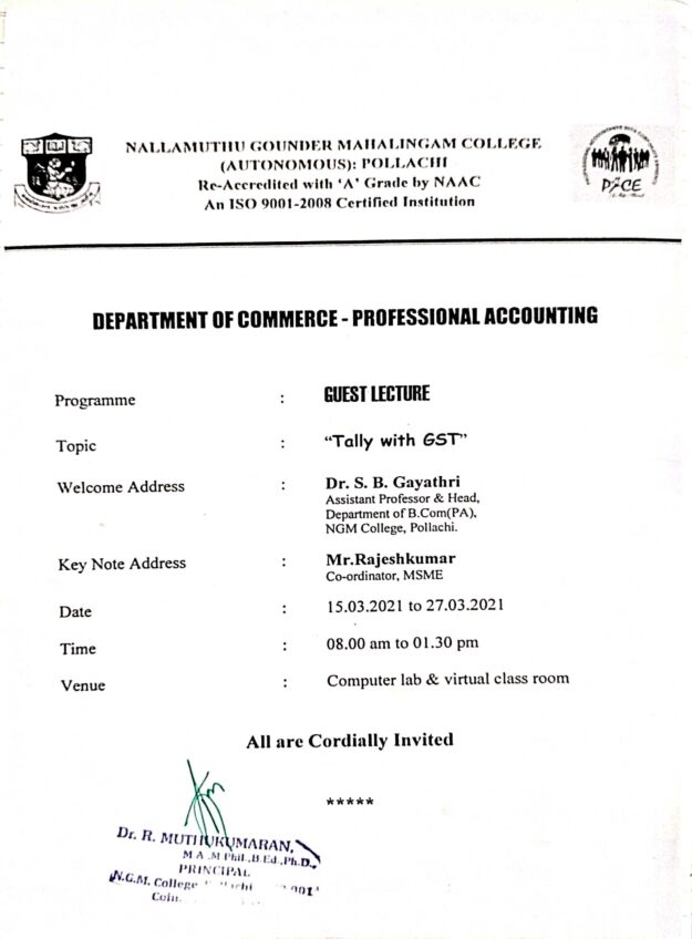 The PG Department of English organized an online guest lecture on 26.10.2021 on the topic “Feministic Perspectives in Nadia Hashimi’s Fiction”. Dr. M. Subashini, Associate Professor, Department of English, GVG College, Udumalpet was the speaker for the programme. Forty seven students and four staff members from the PG Department of English, NGM College attended…