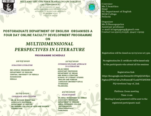 PG Department of English organised a Four Day (Online) Faculty Development Programme on Multidimensional Perspective in Literature. Faculties, Scholars and students of various institutions our country took part in it.
